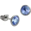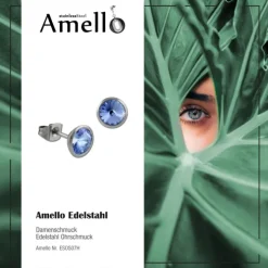 Ein Paar Edelstahl Ohrstecker rund mit einem hellblauen Zirkonias Stein für die modische, trendbewußte Frau. Die stylischen Ohrringe aus der Amello Edelstahl Kollektion glitzern und funkeln in der Farbe hellblau.