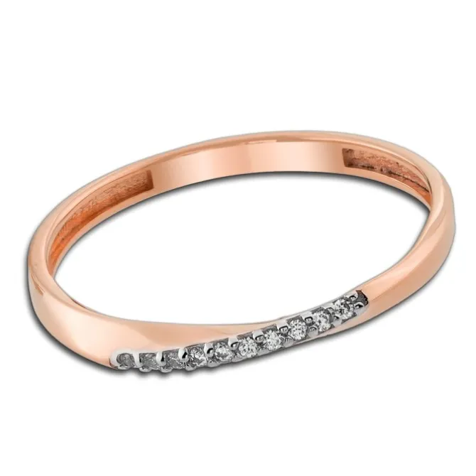 Moderner Ring Swing aus 333er Rosegold gefertigt. Die Ringschiene ist mit vielen kleinen weißen Zirkonias besetzt. Der Ring hat eine Größe von 56 (17,8).