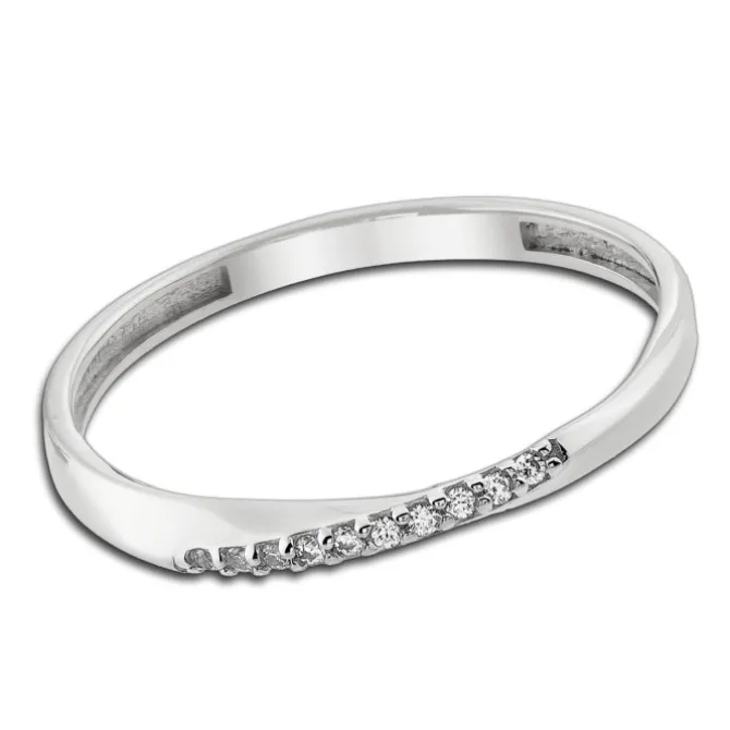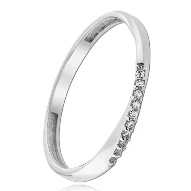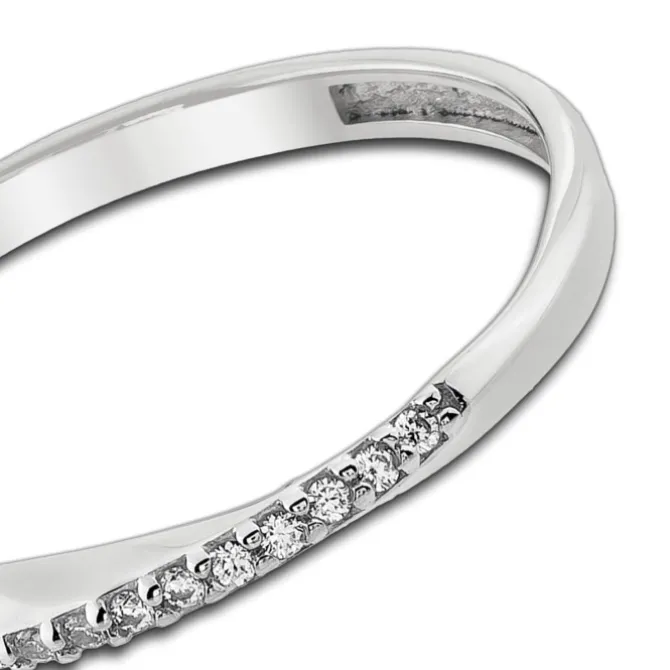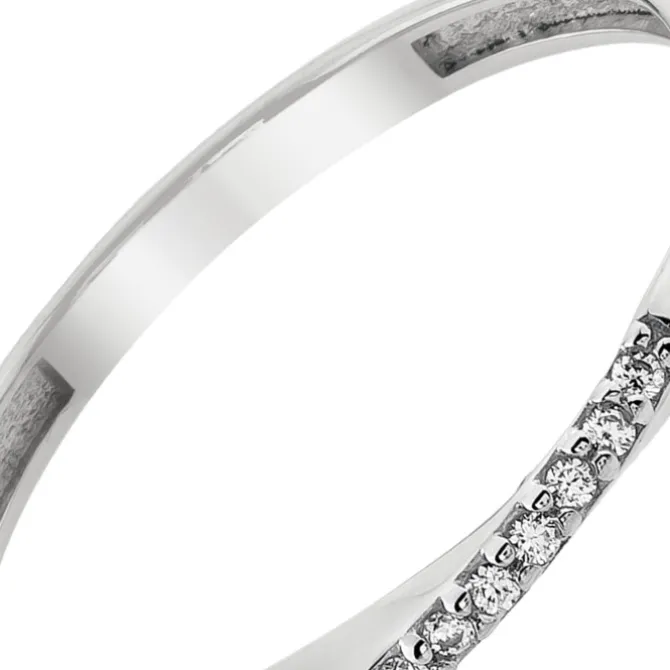 Moderner Ring Swing aus 333er Weißgold gefertigt. Die Ringschiene ist mit vielen kleinen weißen Zirkonias besetzt. Der Ring hat eine Größe von 60 (19,1).