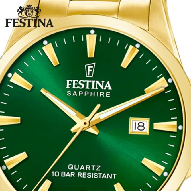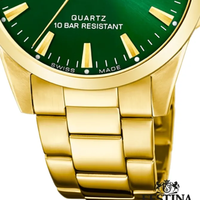 Diese einzigartige Uhr für Herren aus der aktuellen Festina Swiss made Kollektion garantiert hohen Tragekomfort durch das hochwertige Edelstahl-Armband in gold. Die Armbanduhr mit analoger Anzeige und präzisem Armbanduhr ist ein zuverlässiger Begleiter in Alltag und Freizeit.