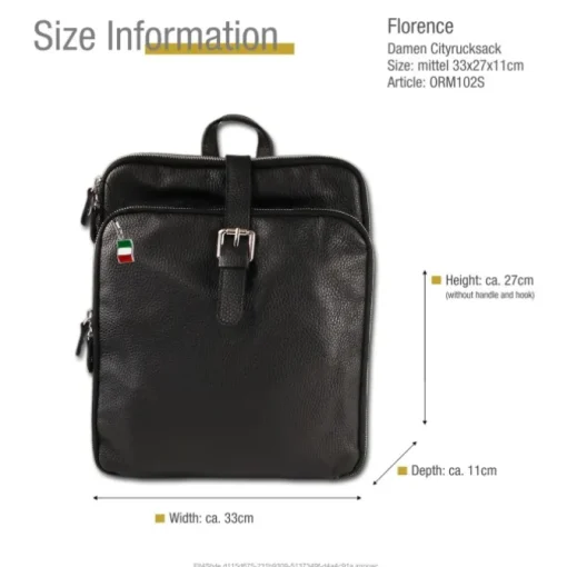 Moderner Damenrucksack aus echtem, weichem Kalbsleder – Made in Italy. Dieser stilvolle Rucksack hat Platz für alles Wesentliche und ist ideal für die Stadt und Freizeit geeignet. In den vielen Taschen kann man seine Utensilien gut und übersichtlich verstauen. Das Design ist sportlich und funktionell. Er hat zu dem Reißverschluss auch noch einen Druckknopfverschluss für die bessere Sicherheit. Im Lieferumfang enthalten ist ein kleiner Italien-Anhänger, der am Produkt oder auch als Handyanhänger getragen werden kann.