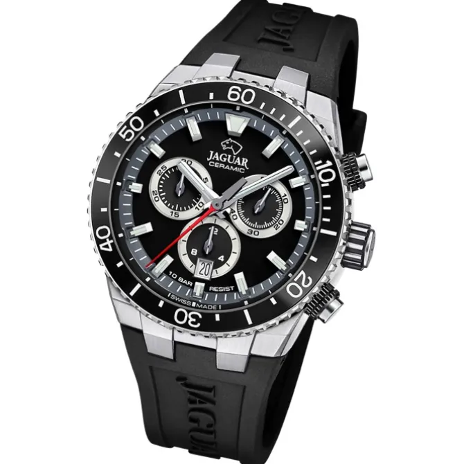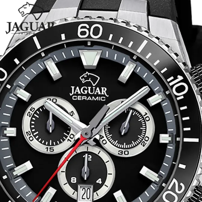 Diese einzigartige Uhr für Herren aus der aktuellen Jaguar Ceramic Kollektion garantiert hohen Tragekomfort durch das hochwertige Silikon-Armband in schwarz. Der Chronograph und präzisem Armbanduhr ist ein zuverlässiger Begleiter in Alltag und Freizeit.