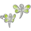 Teenie-Weenie Kinder Ohrstecker 3D Libelle mit hellgrüner Emaille und kleinen weißen Zirkonias aus unserer Kinderschmuck Kollektion aus anlaufgeschütztem 925 Sterling Silber. Die Kristalle funkeln und glitzern auf dem Ohrring.