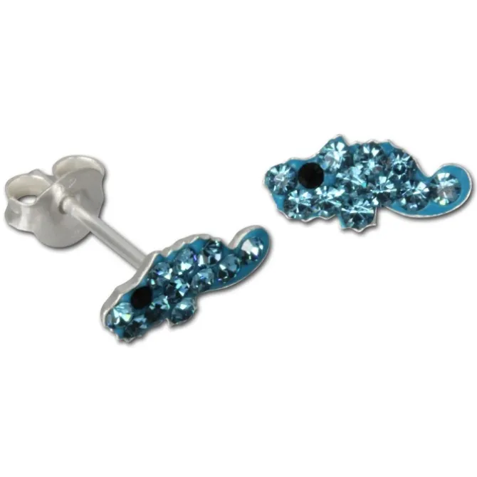 Teenie-Weenie Kinder Ohrstecker Chamäleon mit vielen kleinen türkisen Zirkonias aus unserer Kinderschmuck Kollektion aus anlaufgeschütztem 925 Sterling Silber. Die Kristalle funkeln und glitzern auf dem Ohrring.