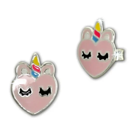 Ein Paar Teenie-Weenie Kinder Ohrstecker — herzförmiger Einhorn-Kopf rosa — aus unserer Kinderschmuck Kollektion. Die niedlichen Ohrringe ist mit Emaille Lack bemalt und aus anlaufgeschütztem 925 Sterling Silber.