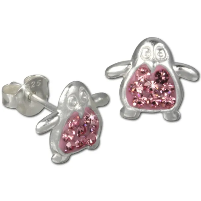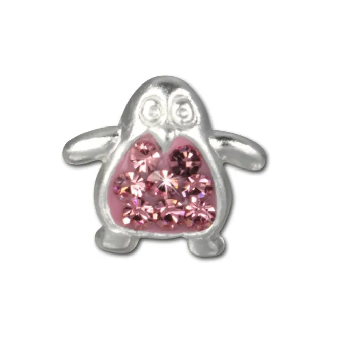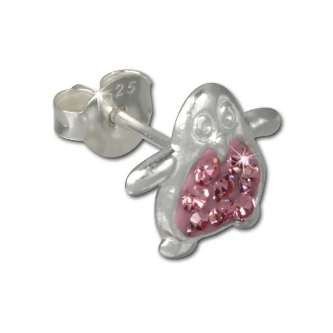 Teenie-Weenie Kinder Ohrstecker Pinguin mit vielen kleinen rosa Zirkonias aus unserer Kinderschmuck Kollektion aus anlaufgeschütztem 925 Sterling Silber. Die Kristalle funkeln und glitzern auf dem Ohrring.