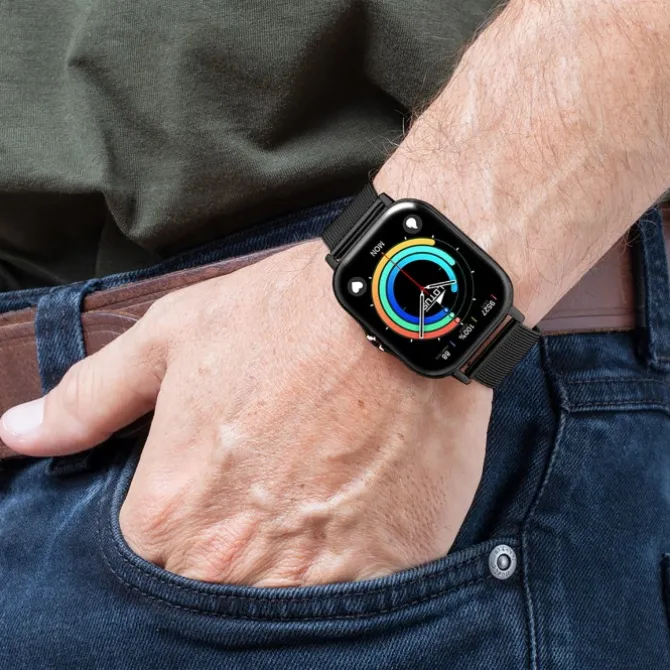 - Funktionen: Smartwatchfunktionen, Uhrzeit, Stoppuhr, Alarm, Datum, 24h-Anzeige