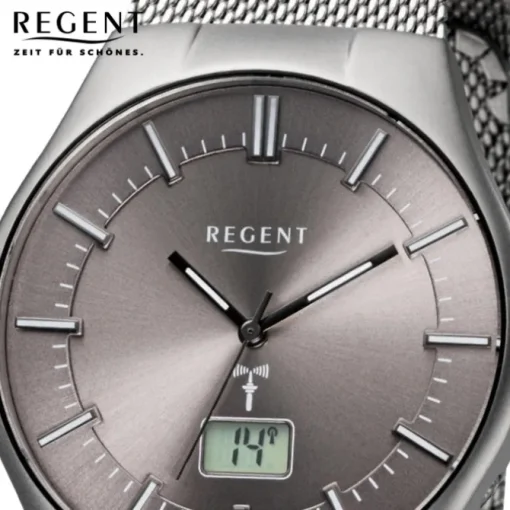 Diese elegante Uhr für Herren, ausgestattet mit einem hochwertigen Edelstahl-Armband in silber, kommt aus der aktuellen Regent Kollektion. Die Analoguhr mit Digitalanzeige zeichnet sich besonders durch ein präzises Funkuhrwerk aus und ist bis 3 bar wasserdicht.