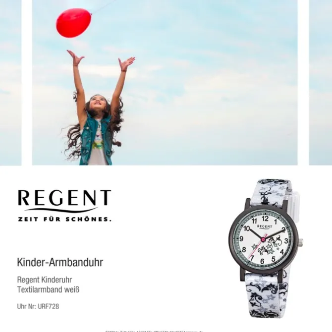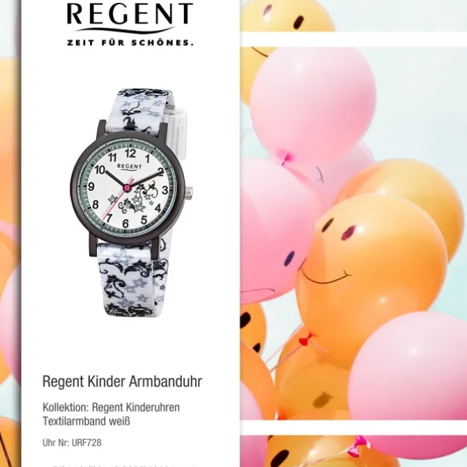 Kinderfreundliche Motive, bequemer Tragekomfort und vor allem farbenfroh – das sind die Kinderuhren von Regent. Dank der übersichtlichen Ziffernblätter und der gut lesbaren Indexe wird das Ablesen der Uhrzeit für Mädchen und Jungen zum Kinderspiel.