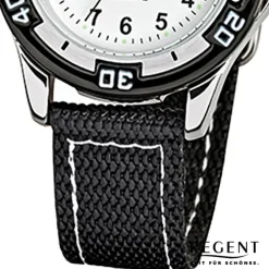 Diese schöne Uhr für Kinder aus der aktuellen Regent Kollektion garantiert hohen Tragekomfort durch das hochwertige Textil, Stoff-Armband in schwarz. Die Armbanduhr mit analoger Anzeige und präzisem Quarzwerk ist ein zuverlässiger Begleiter in Alltag und Freizeit.