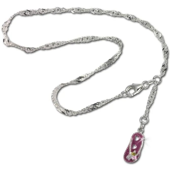 Eine Fußkette mit Flipflop rosa mit kleiner Zirkoniablume 25,5cm mit Karabinerverschluss aus unserer einzigartigen SilberDream Kollektion aus anlaufgeschütztem 925 Sterling Silber.