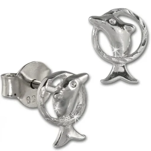 Ein Paar Kinder Ohrstecker – Delfin springt durch Reifen – aus der Teenie-Weenie Schmuck Kollektion aus rhodiniertem, anlaufgeschütztem 925 Sterling Silber.