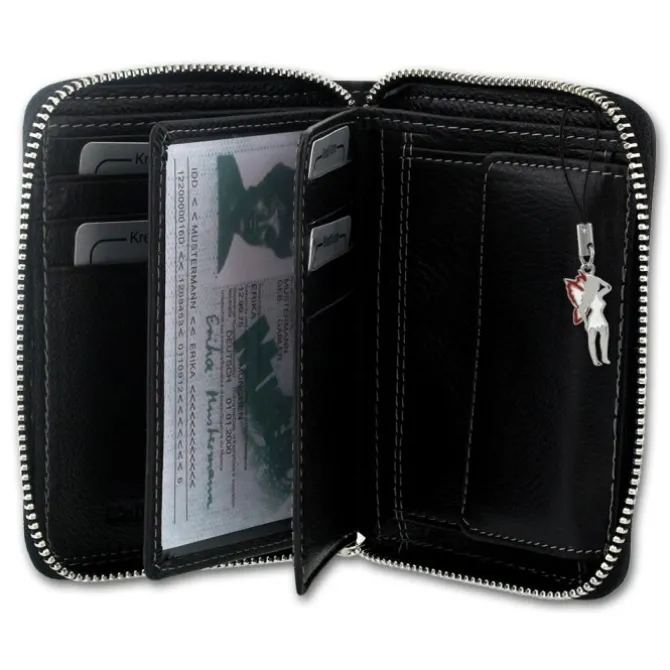Elegante Echtleder Geldbörse im klassischem Schwarz mit hellen Ziernähten, einem Rundum-Reißverschluss und Schriftzug auf der Vorderseite im Hochformat. Zusätzlich ist es mit einem RFID Blocker ausgestattet, so bietet sie Sicherheit für unerlaubtes auslesen Ihrer Daten.