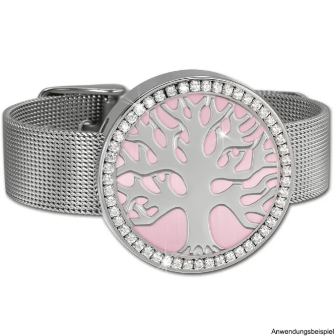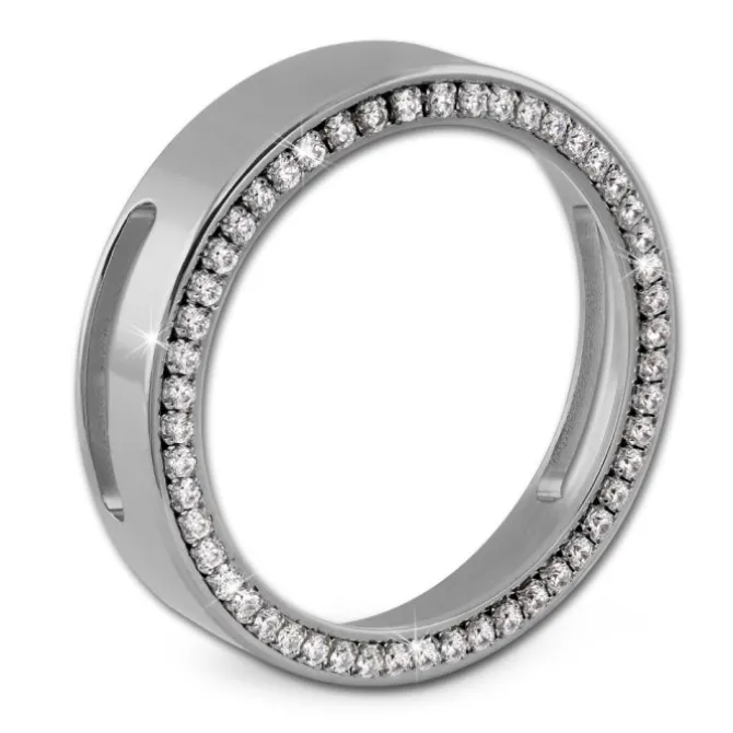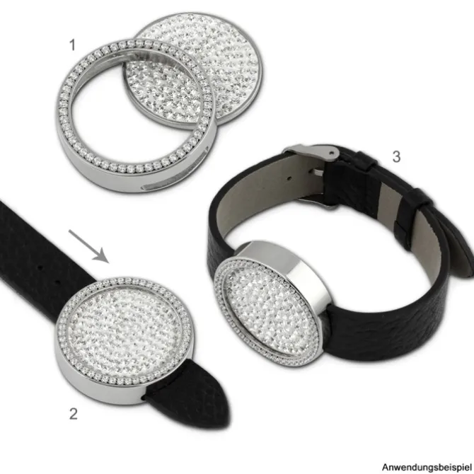 Die Edelstahl-Coinsfassung silber(edelstahlfarben) mit Zirkonia weiß wird an einem Armband getragen. Die Fassung lässt sich auf ein Leder- oder Metallarmband fädeln.