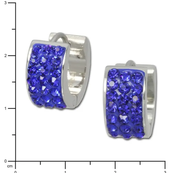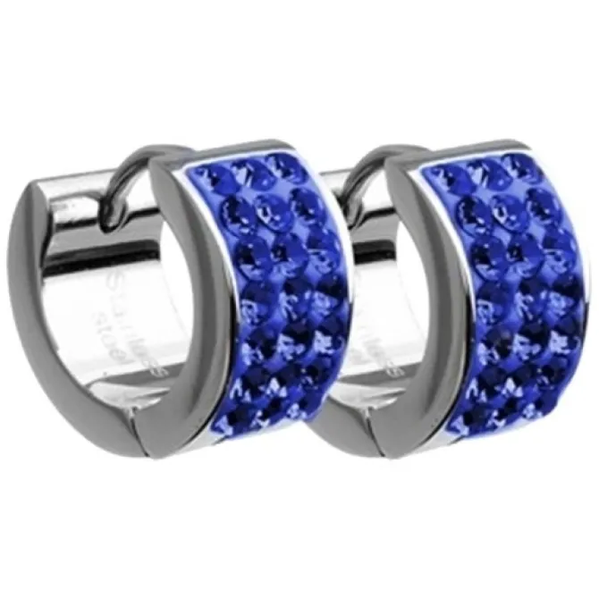Ein Paar Creolen Edelstahl Zirkonia blau mit vielen kleinen Zirkonias für die modische, trendbewußte Frau. Die stylischen Ohrringe aus der Amello Edelstahl Kollektion glitzern und funkeln in der Farbe blau.
