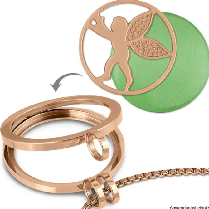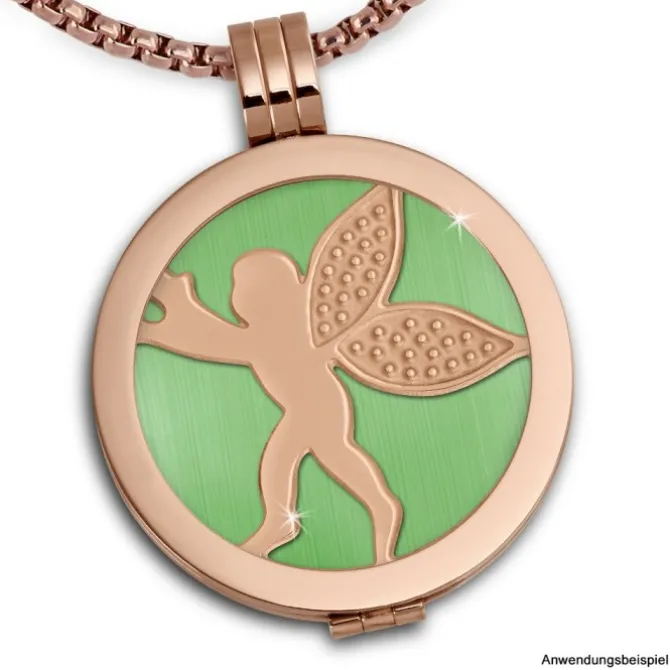 Der Edelstahl-Coin Engel rosevergoldet ist trendig und sehr hochwertig verarbeitet. Der Coin hat einen Durchmesser von 30mm und wird in eine Coinsfassung eingelegt. Der Coin ist ca 1mm dick und kann mit allen anderen Coins in 1mm Stärke kombiniert und als Doppelpack getragen werden. Es entsteht ein toller Effekt, da man verschiede Farben und Materialien unterlegen kann, und diese dann durchscheinen. Man muss nur noch eine Kette durch fädeln und schon ist das individuelle Schmuckstück fertig.