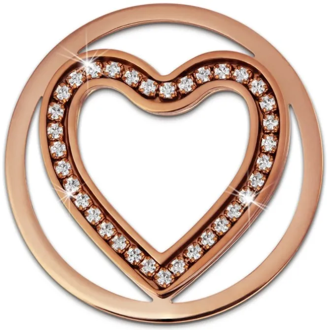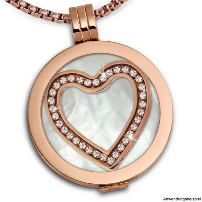 Der Edelstahl-Coin Herz rosevergoldet ist trendig und sehr hochwertig verarbeitet und ist mit vielen kleinen weißen Zirkonias besetzt. Der Coin hat einen Durchmesser von 30mm und wird in eine Coinsfassung eingelegt. Der Coin ist ca 1mm dick und kann mit allen anderen Coins in 1mm Stärke kombiniert und als Doppelpack getragen werden. Es entsteht ein toller Effekt, da man verschiede Farben und Materialien unterlegen kann, und diese dann durchscheinen. Man muss nur noch eine Kette durch fädeln und schon ist das individuelle Schmuckstück fertig.