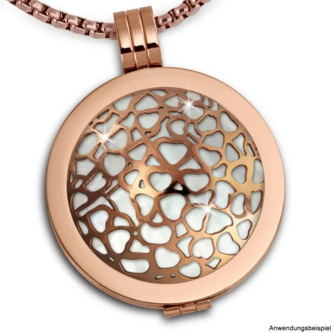 Der Edelstahl-Coin Herzen gewölbt rosevergoldet ist trendig und sehr hochwertig verarbeitet. Der Coin ist mit 333er Rosegold im PVD Beschichtungsverfahren vergoldet. Er hat einen Durchmesser von 30mm und wird in eine Coinsfassung eingelegt. Der Coin ist ca 1mm dick und kann mit allen anderen Coins in 1mm Stärke kombiniert und als Doppelpack getragen werden. Es entsteht ein toller Effekt, da man verschiede Farben und Materialien unterlegen kann, und diese dann durchscheinen. Man muss nur noch eine Kette durch fädeln und schon ist das individuelle Schmuckstück fertig.