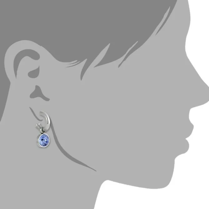Ein Paar Edelstahl Creolen mit einem hängenden hellblauen Zirkonias Stein für die modische, trendbewußte Frau. Die stylischen Ohrringe aus der Amello Edelstahl Kollektion glitzern und funkeln in der Farbe hellblau.