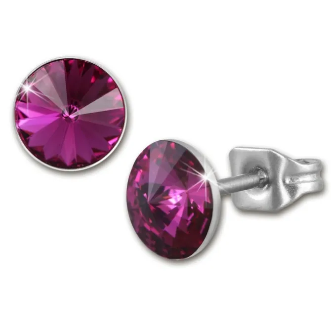 Ein Paar Edelstahl Ohrstecker rund mit einem fuchsia Zirkonia Stein für die modische, trendbewußte Frau. Die stylischen Ohrringe aus der Amello Edelstahl Kollektion glitzern und funkeln in der Farbe fuchsia.