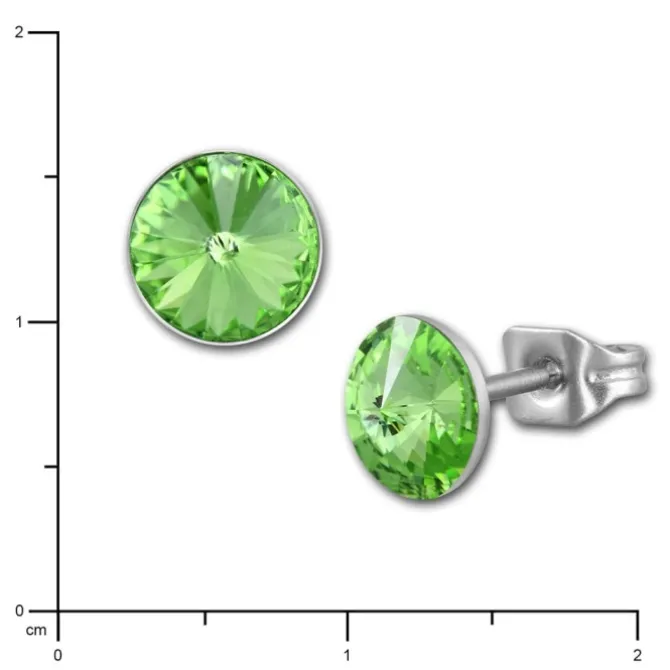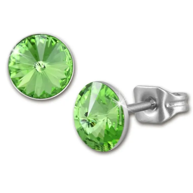Ein Paar Edelstahl Ohrstecker rund mit einem hellgrünen Zirkonia Stein für die modische, trendbewußte Frau. Die stylischen Ohrringe aus der Amello Edelstahl Kollektion glitzern und funkeln in der Farbe grün.