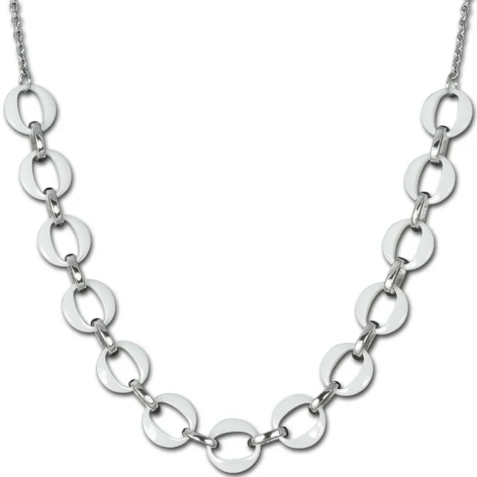 Eine Edelstahl Halskette Ringe mit Keramikelementen und Stahl-Kettenglieder in der Farbe stahl und weiß.