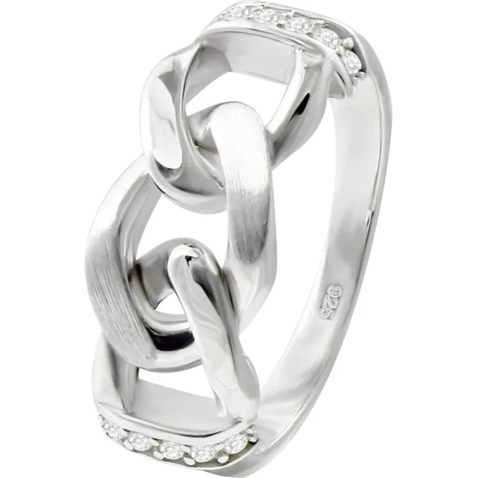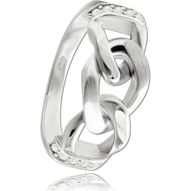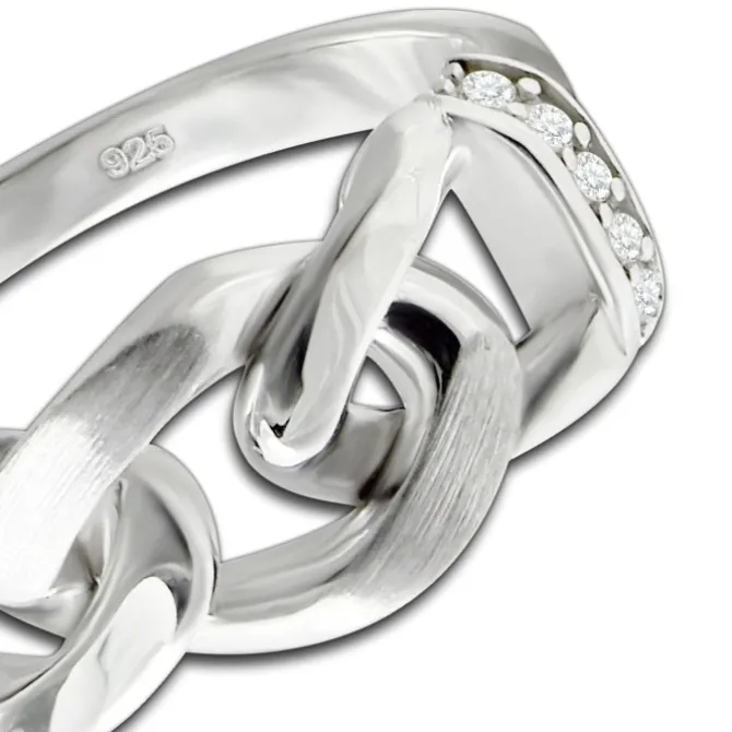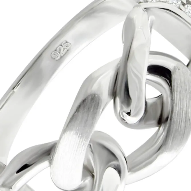 Ein moderner Silberring Ring aus 925er Sterling. Der Ring in Chain Optik ist seitlich auf der Ringschiene mit Zirkonia besetzt. Der Ring hat eine Größe von 58 (18,5).