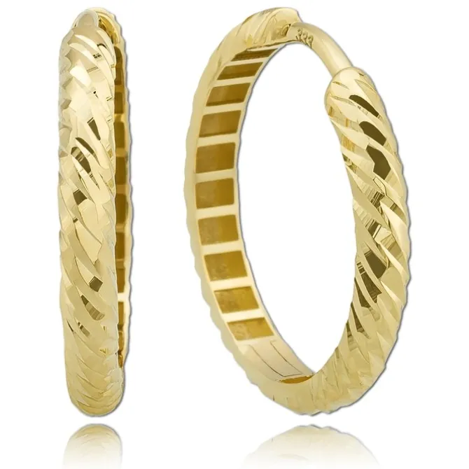 Feminine Creolen aus hochwertigem 333er Gelbgold gefertigt. Die modernen Ohrringe mit einem Durchmesser ca. 21mmm sind mit einem Diamond-Cut Schliff verziert und schmiegen sich gut ans Ohr.