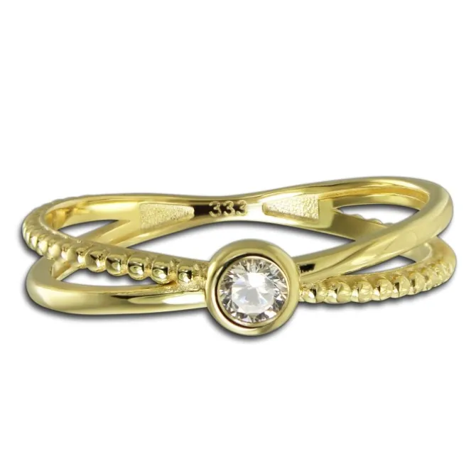 Eleganter Ring aus hochwertigem 333er Gelbgold gefertigt. Der gekreutzt Ring ist mittig einem Zirkoniastein besetzt. Der Ring hat eine Größe von 56 (17,8).