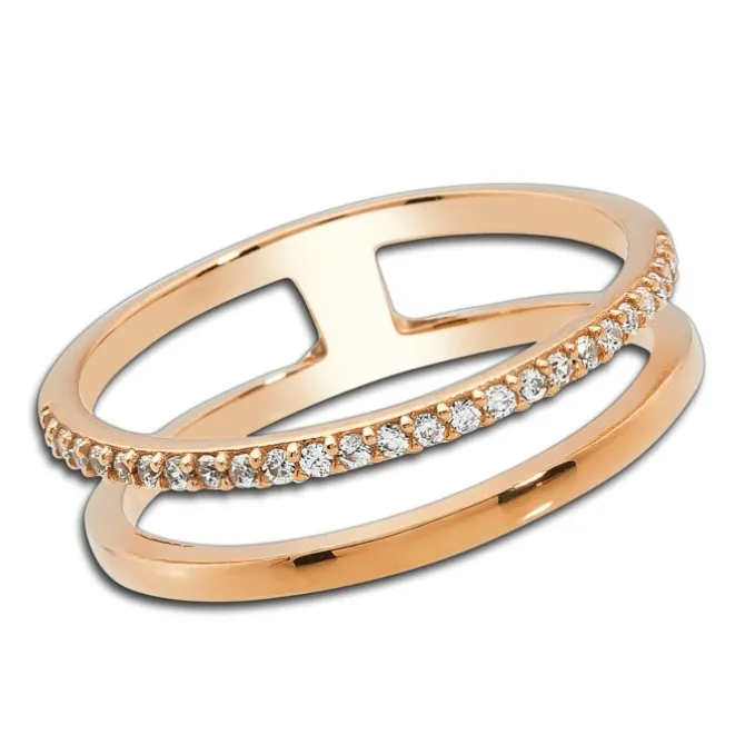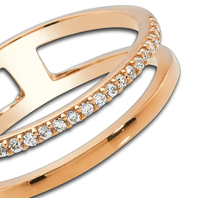 Eleganter Doppel Ring aus hochwertigem 333er Rosegold gefertigt. Auf der einen Ringschiene funkelnden viele Zirkonias. Der Ring hat eine Größe von 54 (17,2).