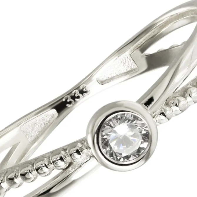 Moderner Ring aus hochwertigem 333er Weißgold gefertigt. Der gekreutzt Ring ist mittig einem Zirkoniastein besetzt. Der Ring hat eine Größe von 60 (19,1).