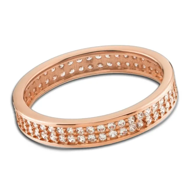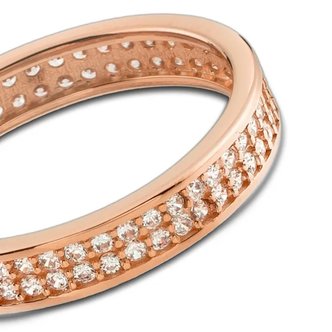 Hochwertiger Ring aus 333er Rosegold gefertigt. Die Ringschiene ist mit zwei Reihen funkelnden Zirkonias besetz. Der Ring hat eine Größe von 56 (17,8).