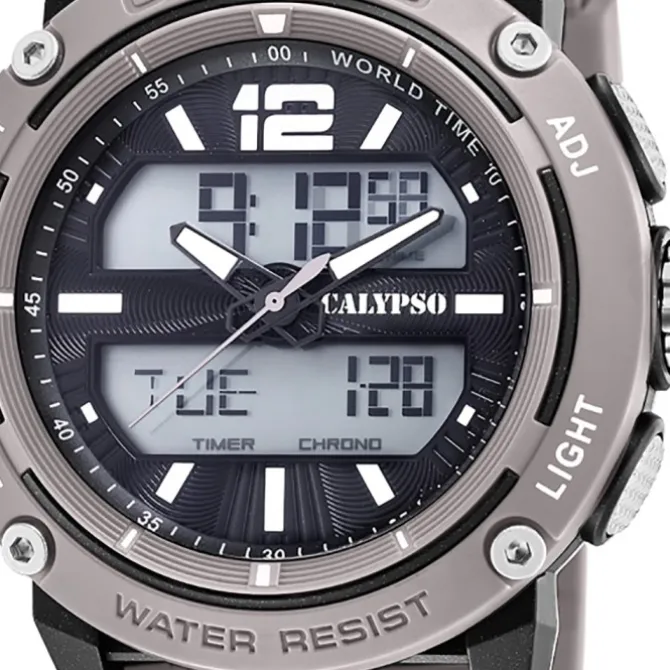 Diese Outdoor Uhr für Herren aus der exklusiven Calypso Digital-Kollektion verfügt über ein hochwertiges Kunststoff-Armband in grau. und die Wasserdichte bis 10 bar machen diese Armbanduhr zu einem besonders zuverlässigen Begleiter.