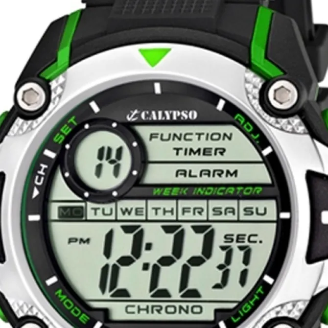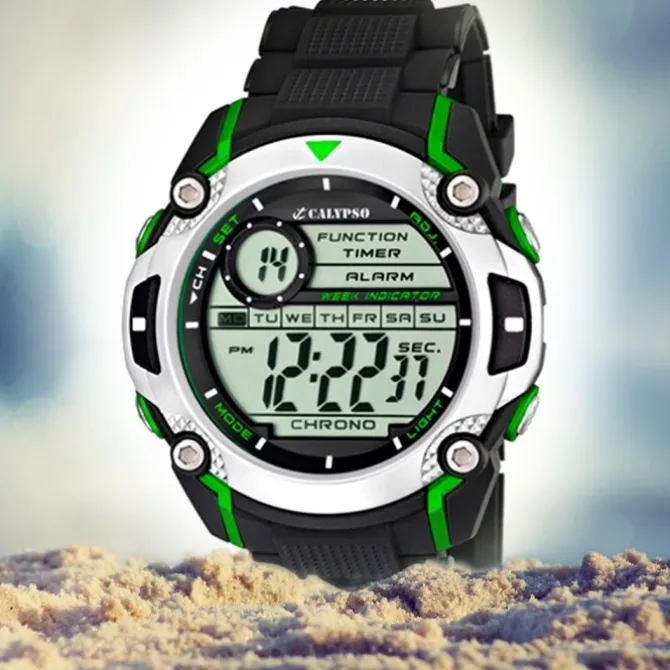 Sportlicher Calypso Herrenfunktionsuhr mit digitaler Anzeige und grünen Highlights. Diese Uhr für Herren wurde aus qualitativ hochwertigen, absolut hautverträglichen Materialien gefertigt.