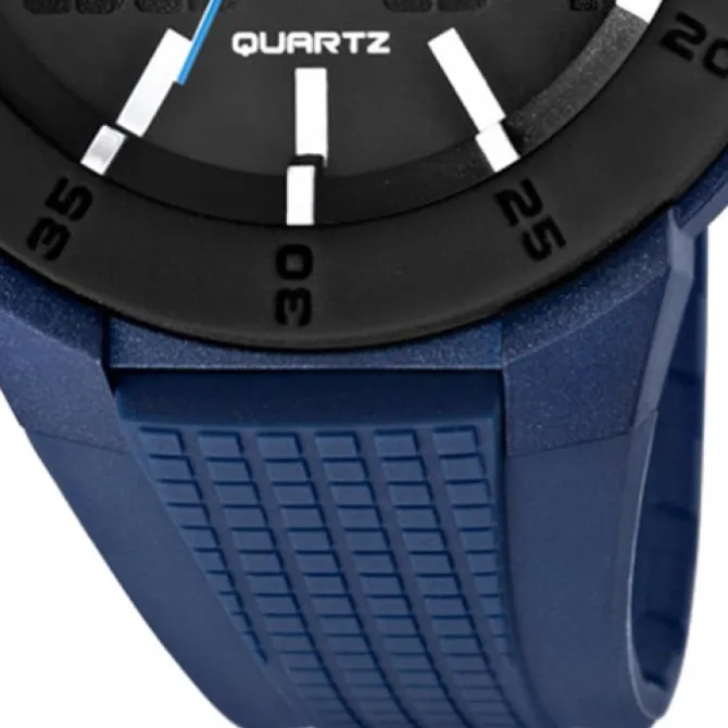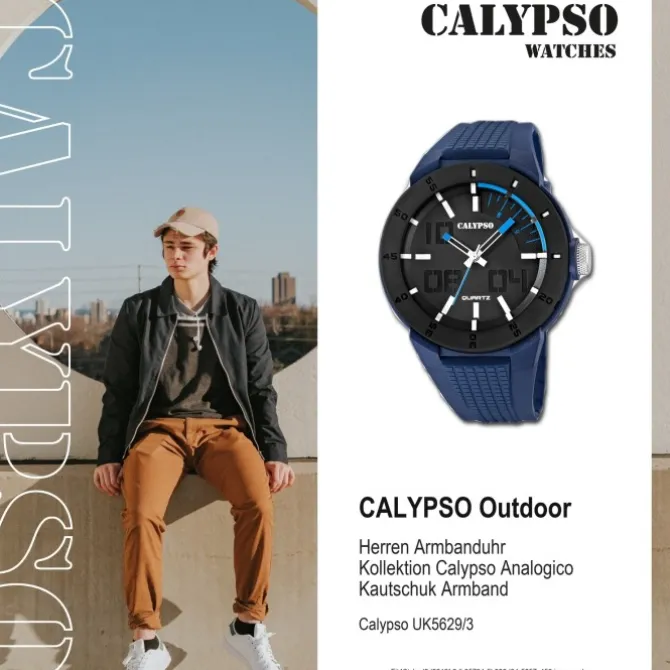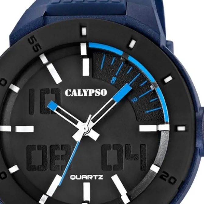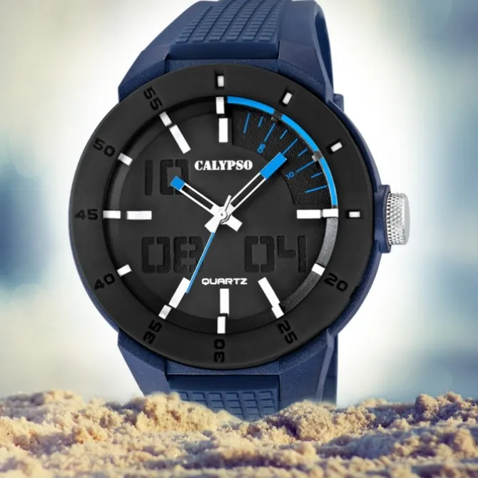 Sportlich elegante Calypso Uhr für Herren mit blauem Kautschuk-Band und analoger Anzeige.