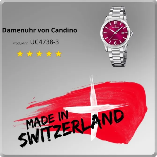 Candino Armbanduhren sind für Damen und Herren mit hohen Ansprüchen an Qualität und Design. Das-Swiss Made-Siegel garantiert Ihnen hervorragende Schweizer Qualität und die Verarbeitung edler Materialien wie Echtleder und Edelstahl. Die Uhrenmarke bietet ein breites Spektrum an Armbanduhren mit Quarz- und Automatikuhrwerken, welches von eleganten, klassischen Stilen bis hin zu sportlichen Modellen reicht.