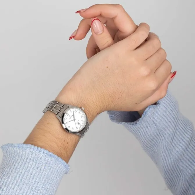Diese einzigartige Uhr für Damen aus der aktuellen Klassik Kollektion garantiert hohen Tragekomfort durch das hochwertige Titan-Armband in silber. Die Armbanduhr mit analoger Anzeige und präzisem Quarzwerk ist ein zuverlässiger Begleiter in Alltag und Freizeit.