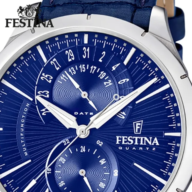 Diese elegante Uhr für Herren aus der exklusiven FESTINA Retro-Kollektion ist mit einem hochwertigen Leder-Armband in blau ausgestattet. Die Analoguhr zeichnet sich besonders durch ein höchst präzises Quarzwerk aus und ist bis 5 bar wasserdicht.