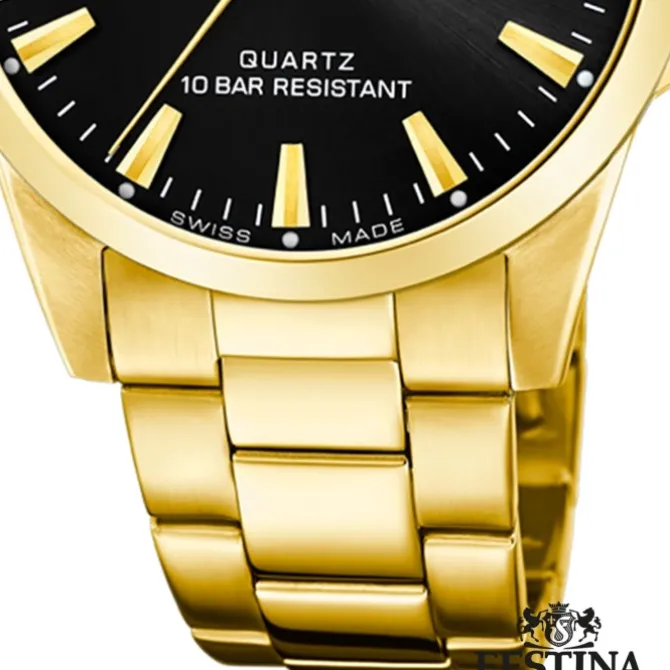 Diese einzigartige Uhr für Herren aus der aktuellen Festina Swiss made Kollektion garantiert hohen Tragekomfort durch das hochwertige Edelstahl-Armband in gold. Die Armbanduhr mit analoger Anzeige und präzisem Armbanduhr ist ein zuverlässiger Begleiter in Alltag und Freizeit.