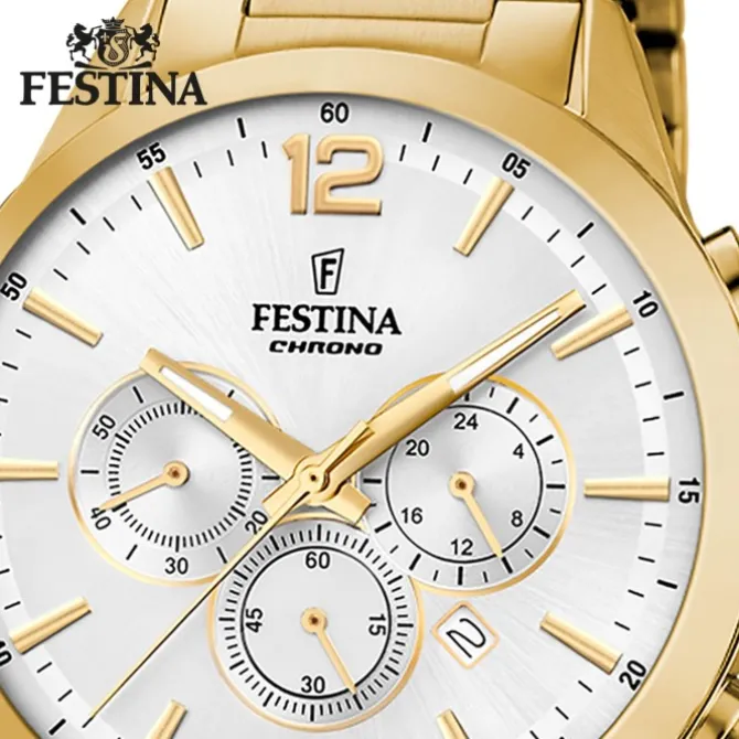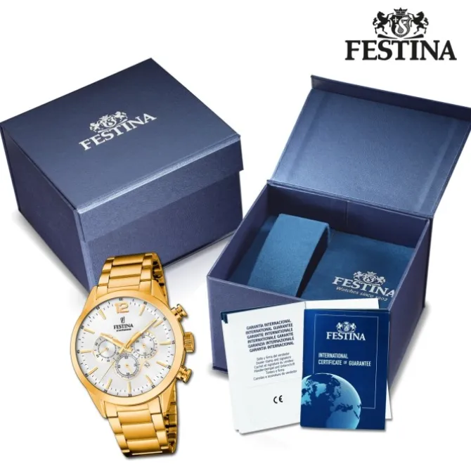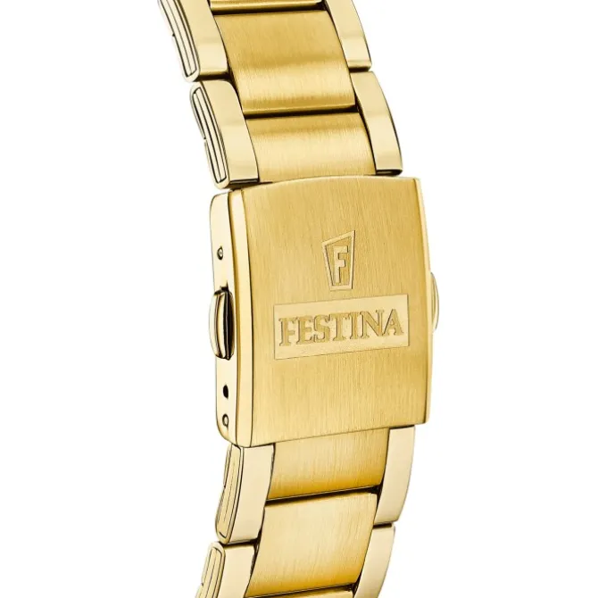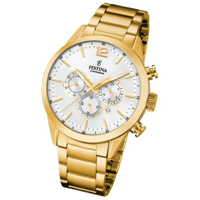 Diese einzigartige Uhr für Herren aus der aktuellen Festina Timeless Chronograph Kollektion garantiert hohen Tragekomfort durch das hochwertige Edelstahl-Armband in gold. Der Chronograph und präzisem Armbanduhr ist ein zuverlässiger Begleiter in Alltag und Freizeit.