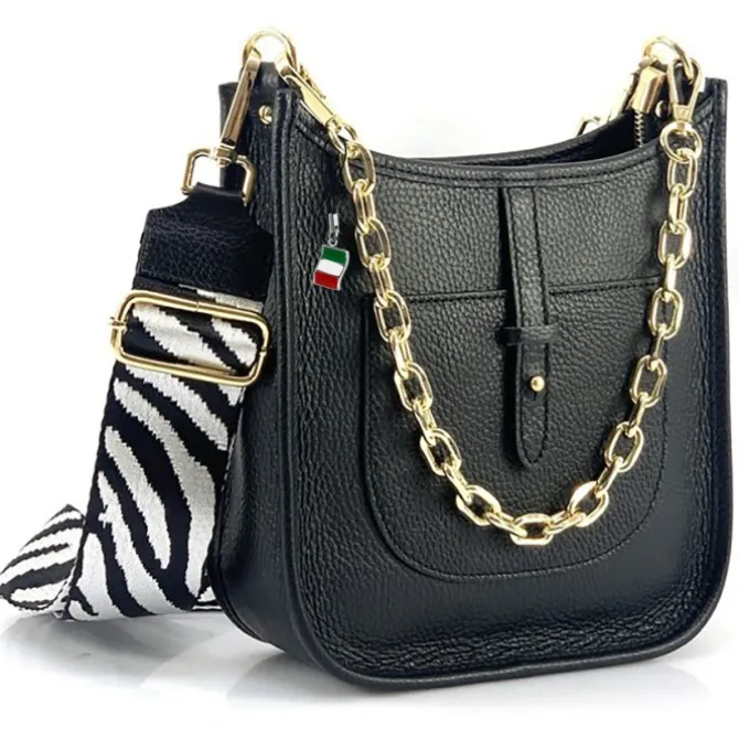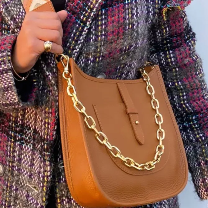 Trendige modische Umhängetasche aus echtem Leder mit einer goldenen Kette und einen langen Canvas-Schultergurt. Mit dieser leichten und kompakten Tasche kommen sie problemlos durch den Tag. Tragen sie die Tasche mit der goldenen Kette in der Hand oder mit dem Gurt diagonal am Körper.