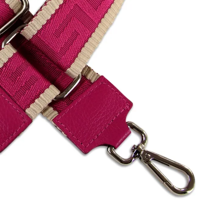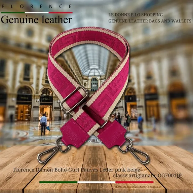 Mit dem stylischen Florence pink, beige-farbenen Canvas, Leder-Tragegurt mit Tragegurt im Boho-Style kann jede Handtasche mit Gurtanschlägen lässig Crossbody über der Schulter oder um die Hüfte getragen werden.