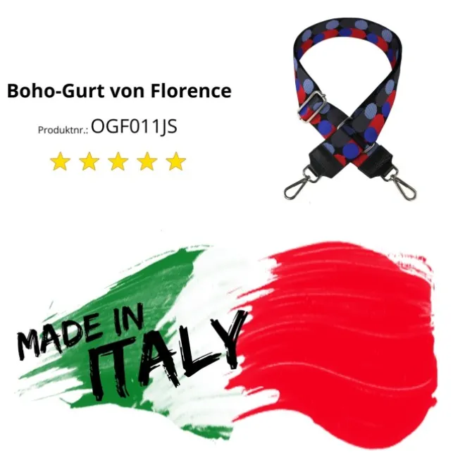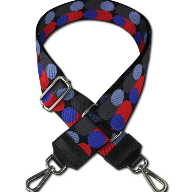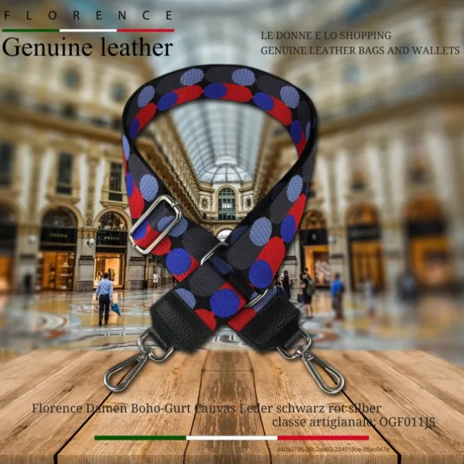 Mit dem stylischen Florence schwarz, rot, silber-farbenen Canvas, Leder-Tragegurt mit Tragegurt im Boho-Style kann jede Handtasche mit Gurtanschlägen lässig Crossbody über der Schulter oder um die Hüfte getragen werden.