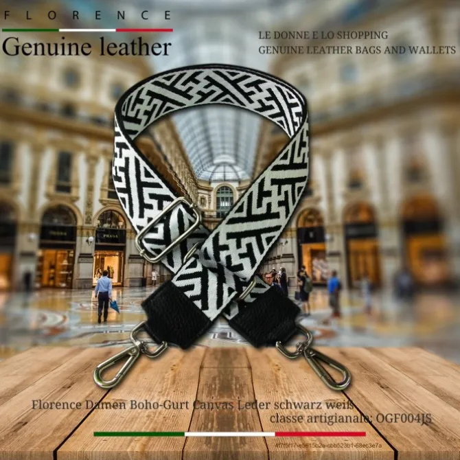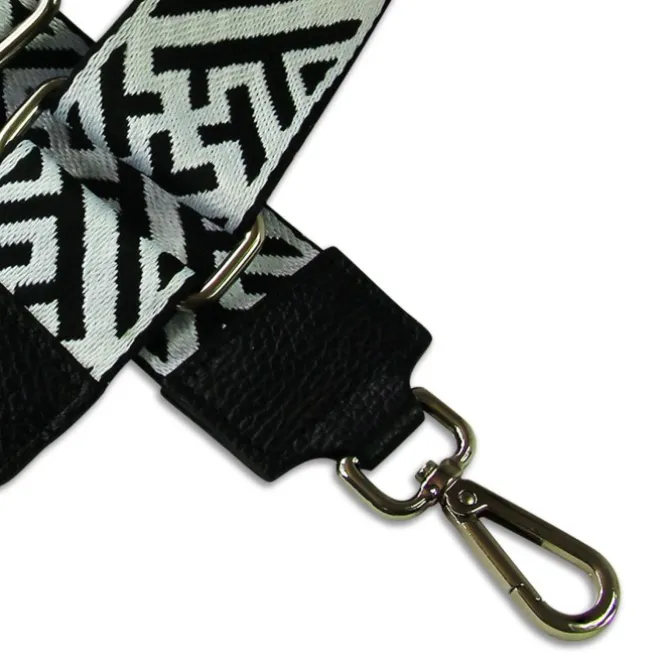 Mit dem stylischen Florence schwarz, weiß-farbenen Canvas, Leder-Tragegurt mit Tragegurt im Boho-Style kann jede Handtasche mit Gurtanschlägen lässig Crossbody über der Schulter oder um die Hüfte getragen werden.