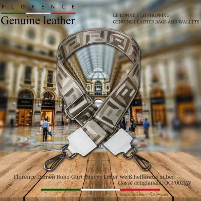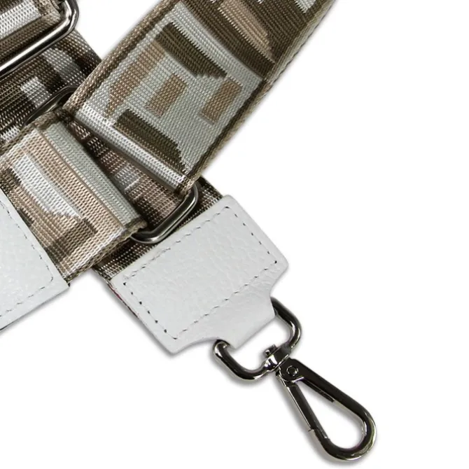 Mit dem stylischen Florence weiß, hellbraun, silber-farbenen Canvas, Leder-Tragegurt mit Tragegurt im Boho-Style kann jede Handtasche mit Gurtanschlägen lässig Crossbody über der Schulter oder um die Hüfte getragen werden.