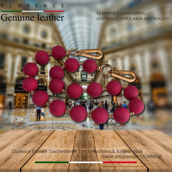 Die stylische Florence Taschenkette pink aus gummifarbenen und metallfarbigen Kugeln kann jede Handtasche zu einem Hingucker machen. Sie kann mit den Karabinern an jeder Öse befestigt werden und individuell eingesetzt werden. Dadurch geben sie ihrer Tasche ein neues Design.