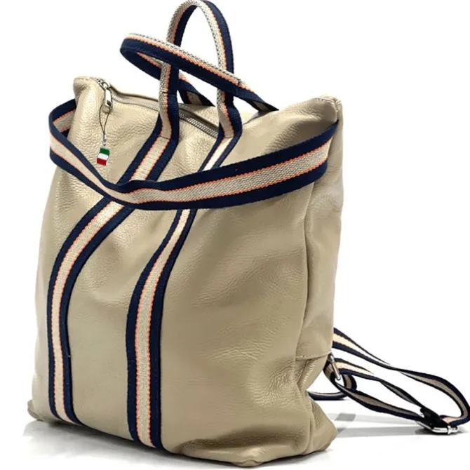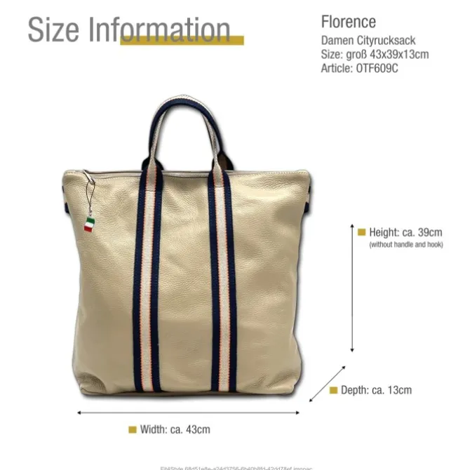 Moderne Damenrucksack aus echtem, weichem Kalbsleder – Made in Italy. Dieser Rucksack lässt sich auch als Schultertasche oder an den 2 Henkeln lässig in der Hand tragen. Der Cityrucksack ist unerlässlich im Businessalltag und in der Freizeit. Er hat Platz für alles Wesentliche, es passt auch ein Laptop rein. Im Lieferumfang enthalten ist ein kleiner Italien-Anhänger, der am Produkt oder auch als Handyanhänger getragen werden kann.