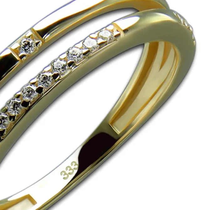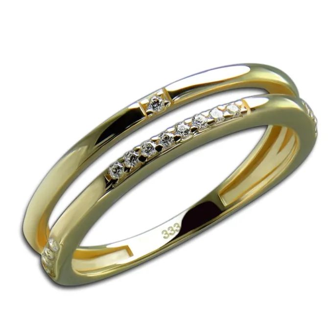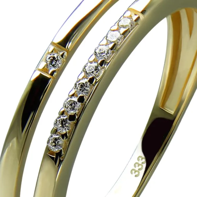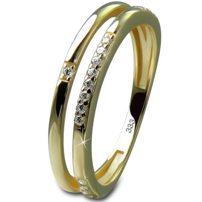 Ein moderner Goldring – Double – aus unserer einzigartigen GoldDream Echtschmuck Kollektion. Auf den Ringschienen sind viele kleine Zirkionas und sie sind miteinander hinten verbunden. Der Ring ist aus anlaufgeschütztem 333er Gelbgold (8-Karat) und hat eine Größe von 56mm Umfang und einen Innendurchmesser von 17,8mm. Es gibt den Goldring auch in den Größen 54, 58 und 60.