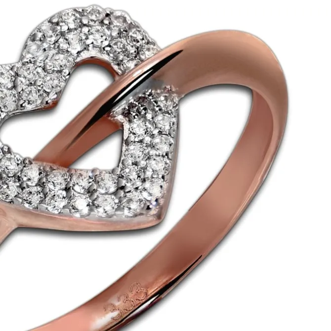 Ein edler Goldring – Herz – aus unserer einzigartigen GoldDream Echtschmuck Kollektion. Das Herz ist zweireihig mit funkelnden Zirkonia besetzt. Der Ring ist aus anlaufgeschütztem 333er Roségold (8-Karat) und hat eine Größe von 60mm Umfang und einen Innendurchmesser von 18,5mm. Es gibt den Goldring auch in den Größen 54, 56 und 58.