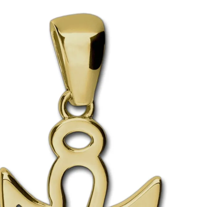 Ein Kettenanhänger – Engel – mit einem weißen Zirkonia. Der Zirkonia funkelt im Engel im klaren weiß. Der Gold-Anhänger ist aus unserer einzigartigen GoldDream Echtschmuck Kollektion aus 333er Gelbgold.